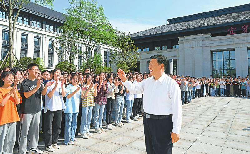 6月8日下午,習(xí)近平在宜賓學(xué)院考察時,向師生們揮手致意。
