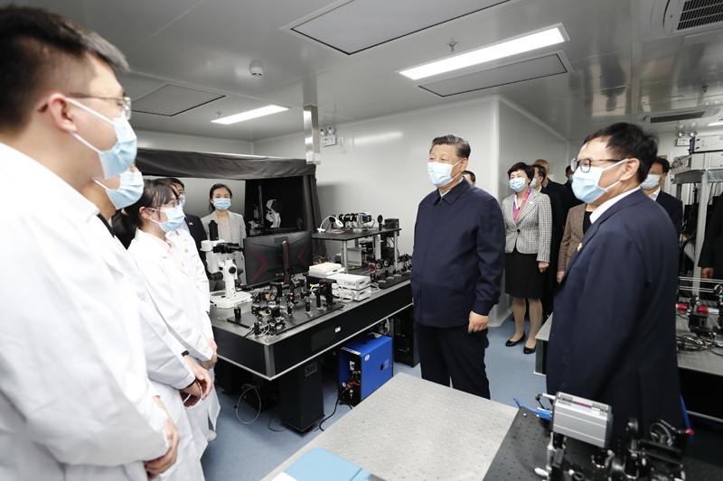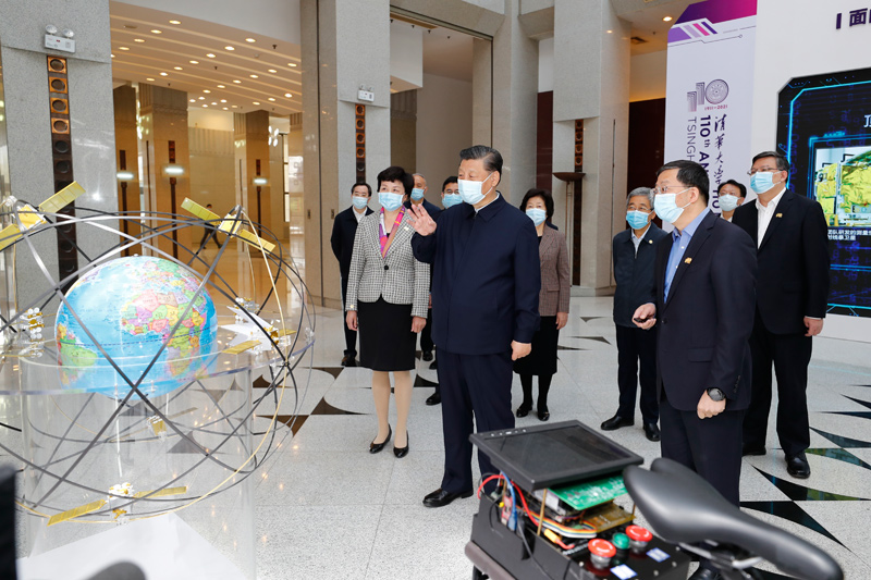 4月19日,在清華大學(xué)建校110周年校慶日即將來臨之際,中共中央總書記、國家主席、中央軍委主席習(xí)近平來到清華大學(xué)考察。這是習(xí)近平在清華大學(xué)成像與智能技術(shù)實(shí)驗(yàn)室同師生們親切交談。新華社記者 黃敬文 攝 清華大學(xué)主樓二層,展示了學(xué)校近年來重點(diǎn)教學(xué)科研成果。習(xí)近平聽取了關(guān)于增強(qiáng)自主創(chuàng)新能力、助力世界主要科學(xué)中心和創(chuàng)新高地建設(shè)、提高人文社會(huì)學(xué)科教育研究水平等情況介紹,對(duì)清華大學(xué)取得的成績給予充分肯定。習(xí)近平指出,要堅(jiān)持中國特色社會(huì)主義教育發(fā)展道路,充分發(fā)揮科研優(yōu)勢(shì),增強(qiáng)學(xué)科設(shè)置的針對(duì)性,加強(qiáng)基礎(chǔ)研究,加大自主創(chuàng)新力度,并從我國改革發(fā)展實(shí)踐中提出新觀點(diǎn)、構(gòu)建新理論,努力構(gòu)建中國特色、中國風(fēng)格、中國氣派的學(xué)科體系、學(xué)術(shù)體系、話語體系。